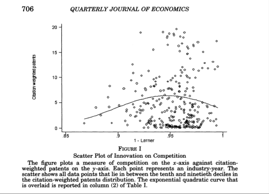Indeed, Aghion’s and Howitt’s own research suggests that monopolists can be stifling for innovation. The figure below is reproduced from their 2005 Quarterly Journal of Economics article titled “Competition and Innovation: An Inverted-U Relationship,”in which they studied the relationship between market power and innovation across UK industries.
