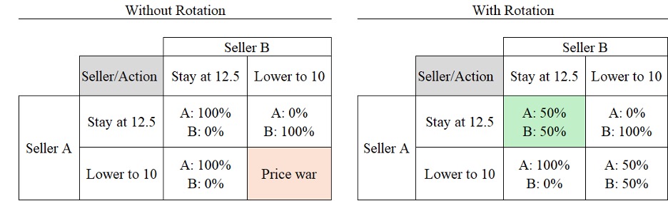 Basic game theory can illustrate the payoff scenarios here. Suppose Seller A has the Buy Box and prices at $12.50. Without rotation, Seller B cannot simply match, it must undercut to get the Buy Box. This will prompt A to respond in turn by undercutting B, resulting in a price war (the bottom right box in the “Without Rotation” scenario). This is the sort of aggressive price competition that would benefit consumers.