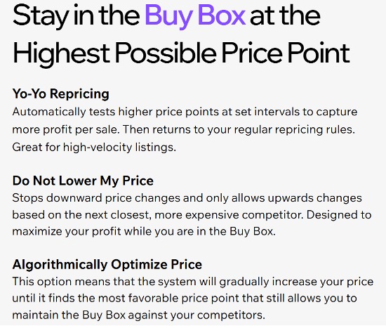 And yet, these repricers openly advertise that their products seek to “avoid price wars” and “look to raise prices 24/7” after their client seller acquires the Buy Box, which one would expect they could only obtain if they were the lowest price offer and would immediately lose upon raising the price.