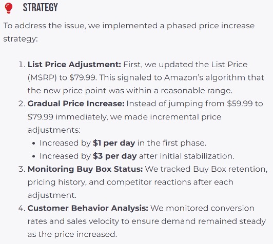 And here’s a case study from marketing agency BellaVix, titled “Successfully raising price while retaining the Buy Box,” that discusses how “A premium skincare brand selling on Amazon faced challenges when attempting to raise the price of their best-selling Crepe Repair Cream from $59.99 to $79.99” (a 33 percent price increase!).