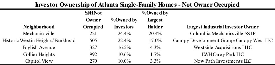 A prominent example is Historic Westin Heights/Bankhead, a neighborhood just outside of Atlanta’s downtown. Bankhead’s single-family housing stock is dominated by Canopy Development Group, which holds 11 percent of all homes in the neighborhood and 17 percent of homes that are not owner-occupied. (According to its website, Canopy “is leading the largest land and property acquisition effort in Atlanta’s Westside Beltline area.” Per the Atlantic Journal-Constitution, Canopy “has used anonymous limited liability corporations to buy up large portions of west Atlanta’s impoverished English Avenue neighborhood.” While Canopy has developed properties as well, it obtained its status via acquisition.). Mechanicsville, named for the mechanics who worked on the rail line, is another neighborhood community with substantial investor ownership, with investors holding 14 percent of all homes and 24 percent of homes that are not owner-occupied.